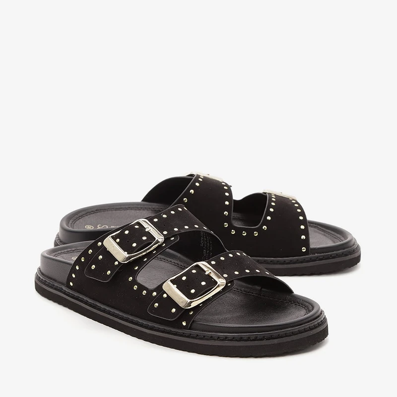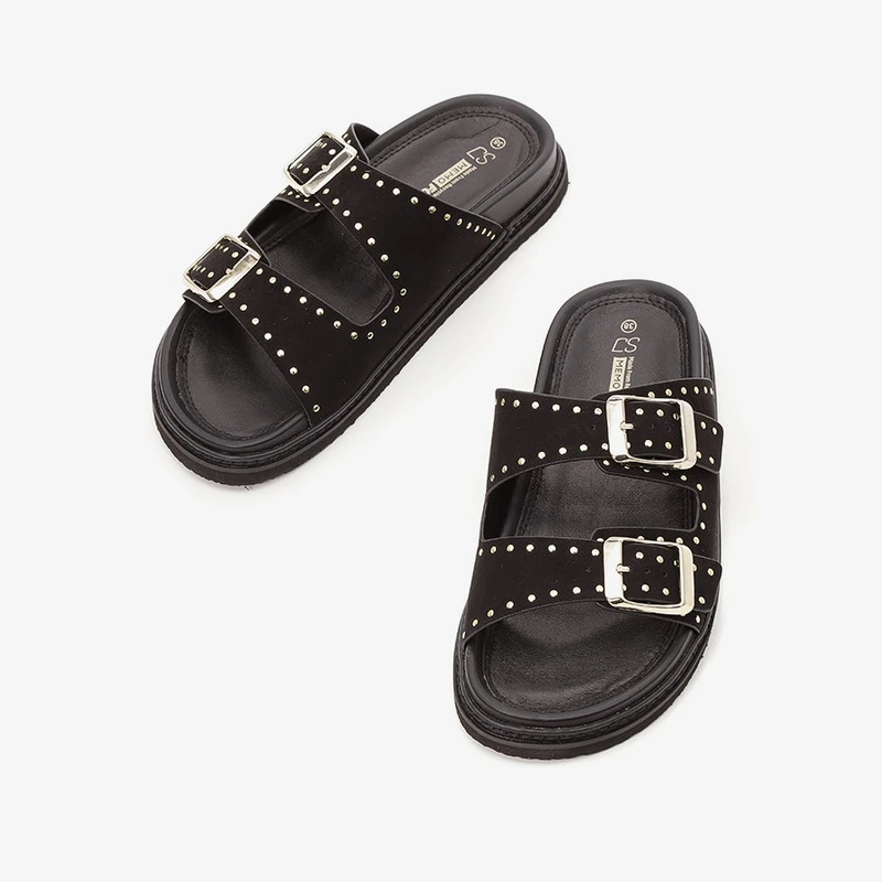 כפכפי נשים מעוצבים עם אבזמים וניטים מוזהבים, מעניקים מראה טרנדי ויוקרתי. סוליה נוחה במיוחד ליום-יום, כך שתוכלי ליהנות מנעליים נוחות לכל שעות היום. זמינים במידות 36-41!