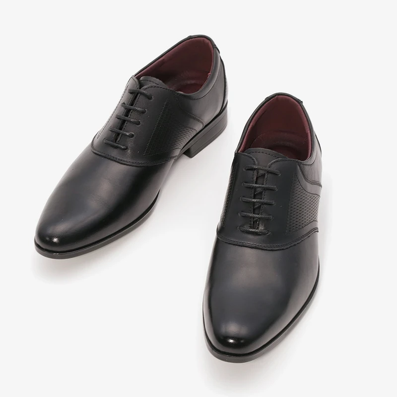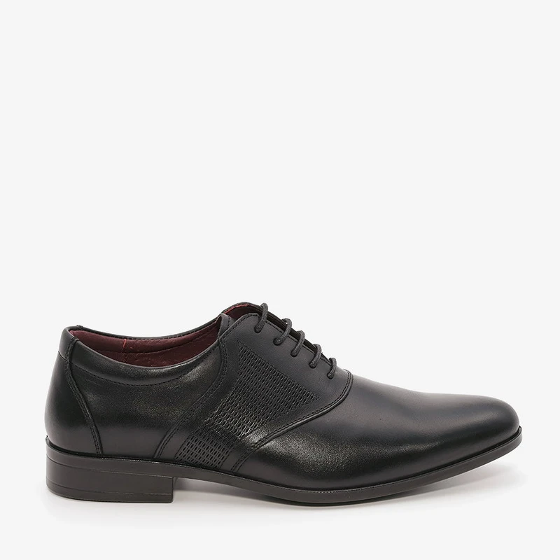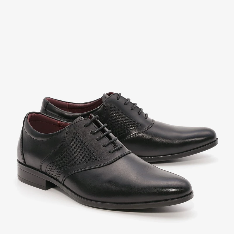 נעלי אלגנט לגבר עם שרוכים מעור בתוספת תפרים בקדמת הנעל ובשילוב עיטורי טקסטורה.