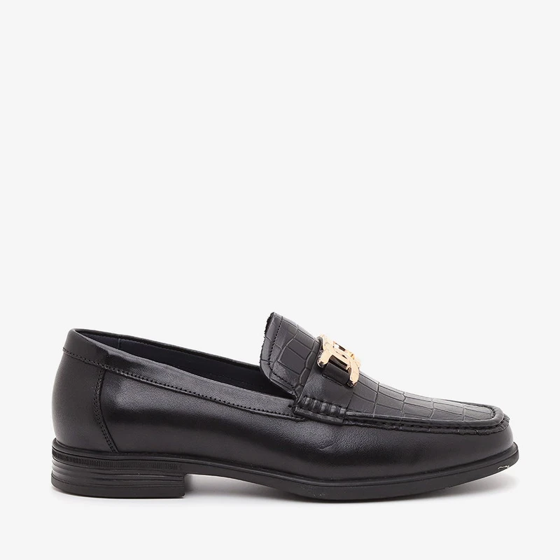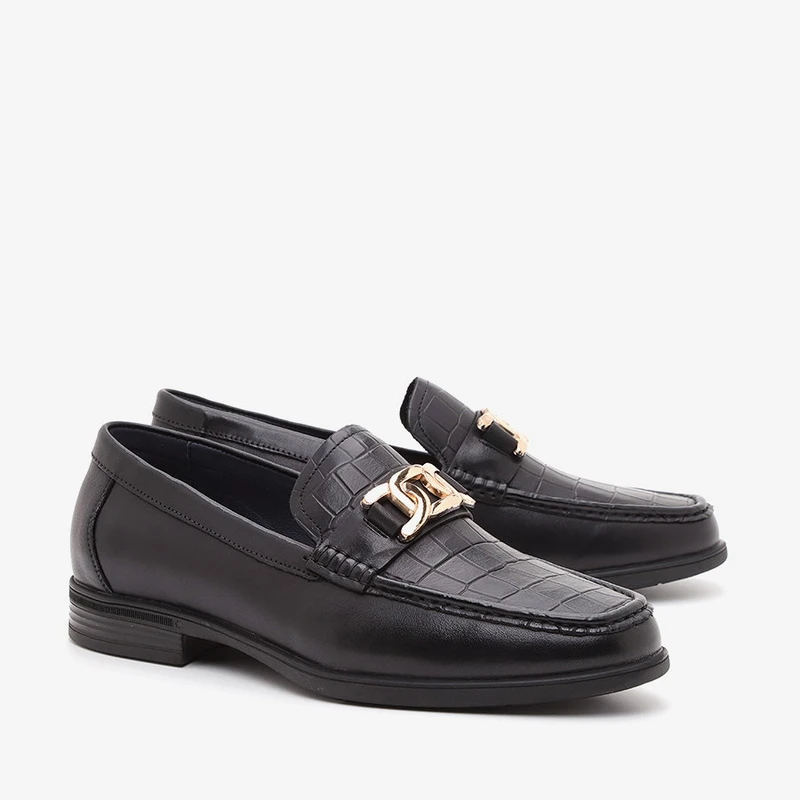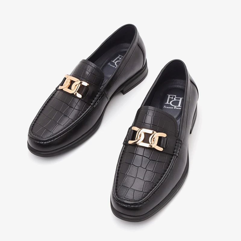 נעלי מוקסין לגברים גייקוב 11505 – אלגנטיות ונוחות בנעל אחת! נעלי מוקסין שחורות מעור איכותי בעיצוב קלאסי עם טקסטורת תנין ואבזם בגוון זהב. הסוליה הרכה והמדרס התומך מבטיחים נוחות לאורך כל היום והערב. מושלם לכל אירוע, בין אם בעבודה או לאירוע בערב.