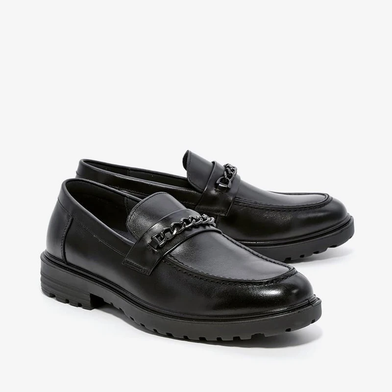 הנעלים עשויות עור עם אבזם שרשרת בצבע כסוף כהה.