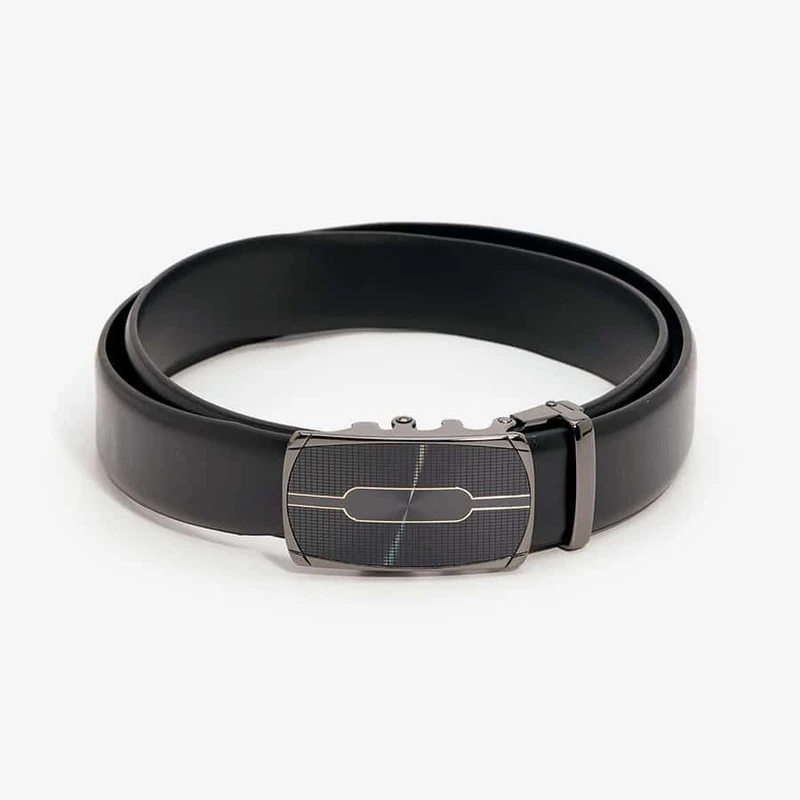 חגורה אלגנטית עם אבזם קלאץ' מלבני בעל מסגרת מושחרת ועיטורים, דוגמה עם פסים זהובים דקים במרכז.