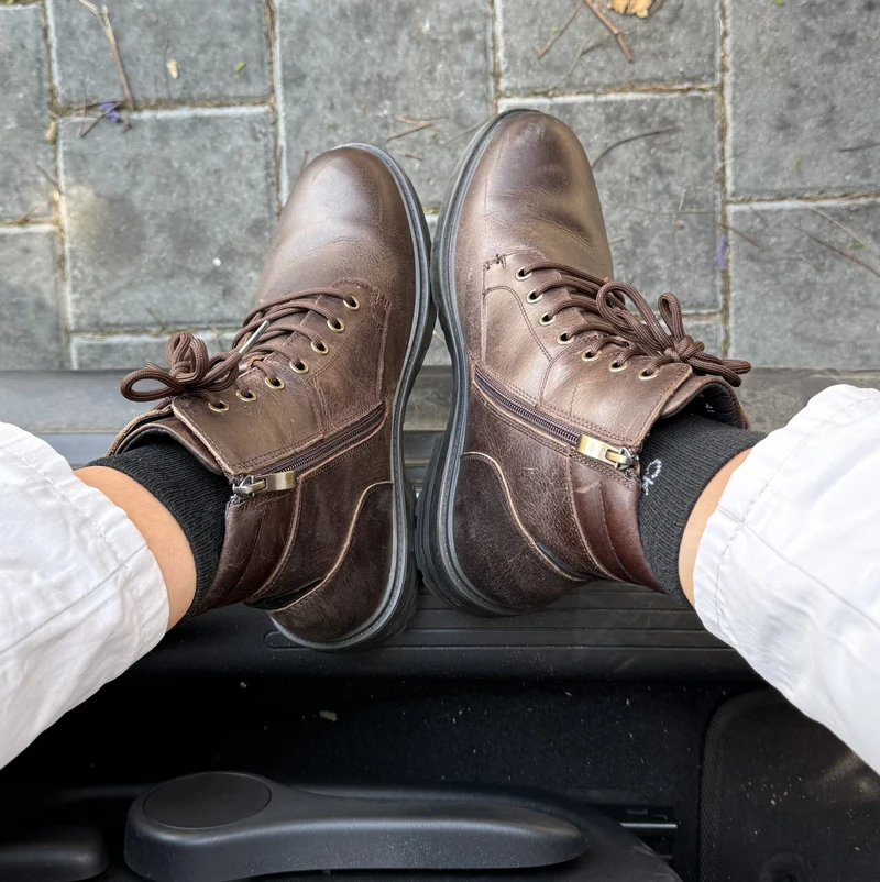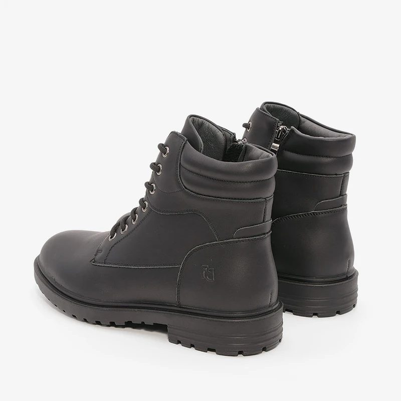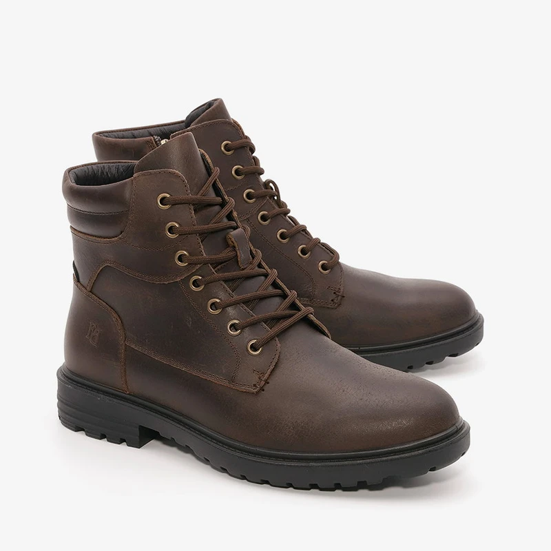 מגפיים לגבר מעור בעיצוב קלאסי עם שרוכים ורוכסן בחלק הפנימי של המגפיים לנעילה נוחה ומהירה.