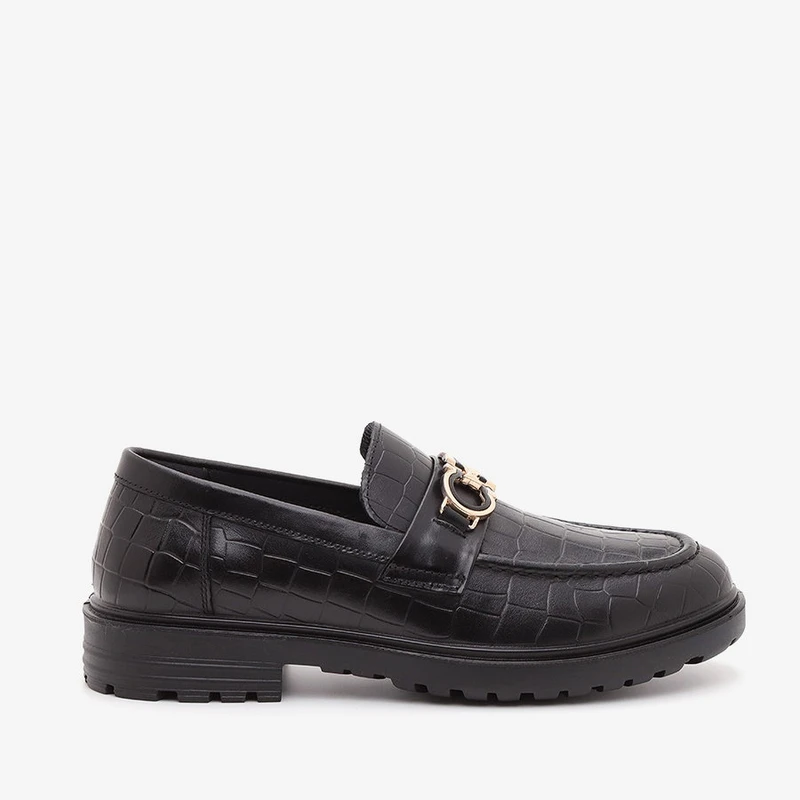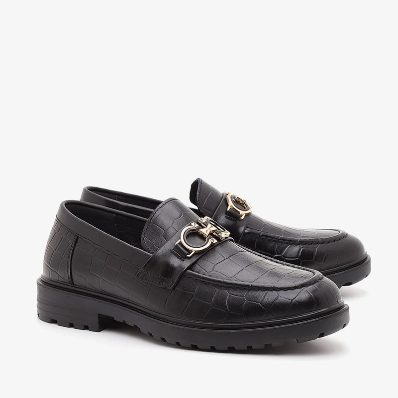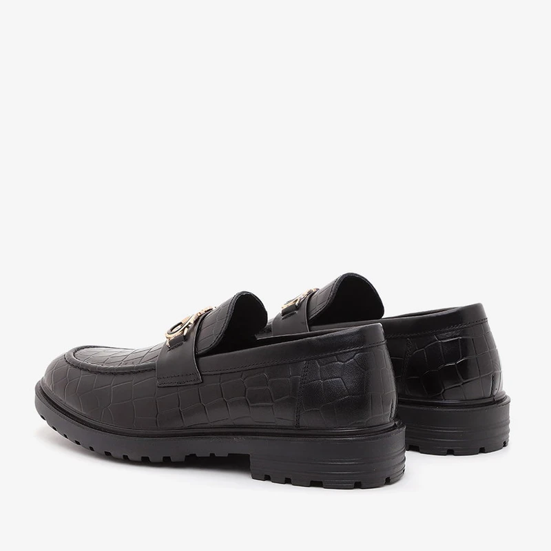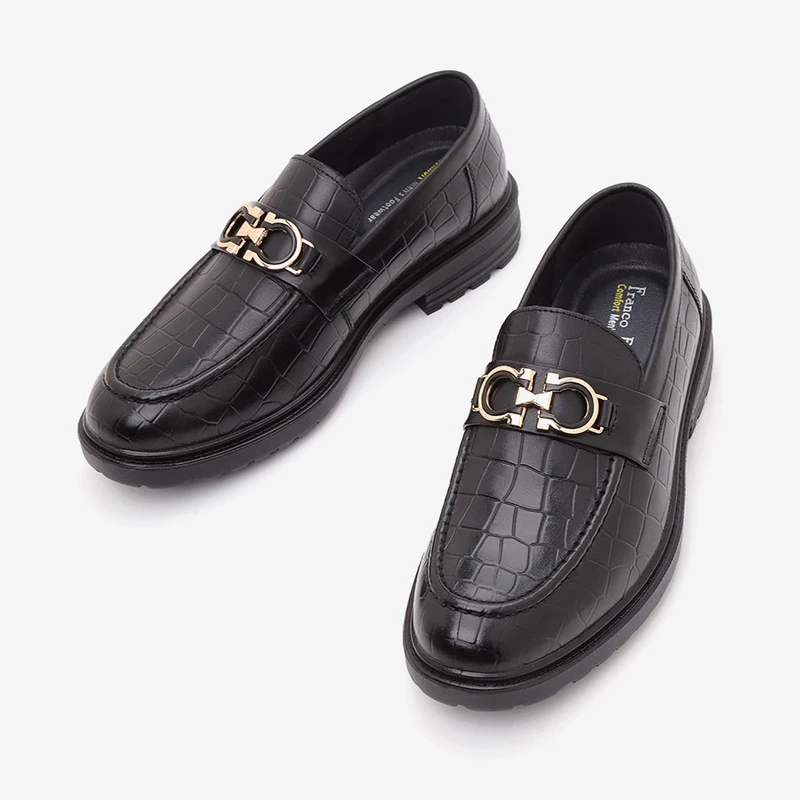 מוקסין לגברים טרקטור שחור מבית Franco Bane. עיצוב איטלקי קלאסי עם סוליית טרקטור אופנתית. עשוי מעור איכותי, בשילוב אבזם בצבע זהב.