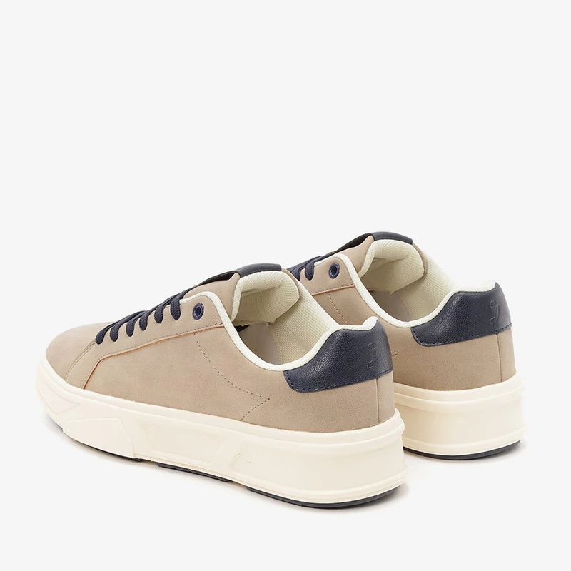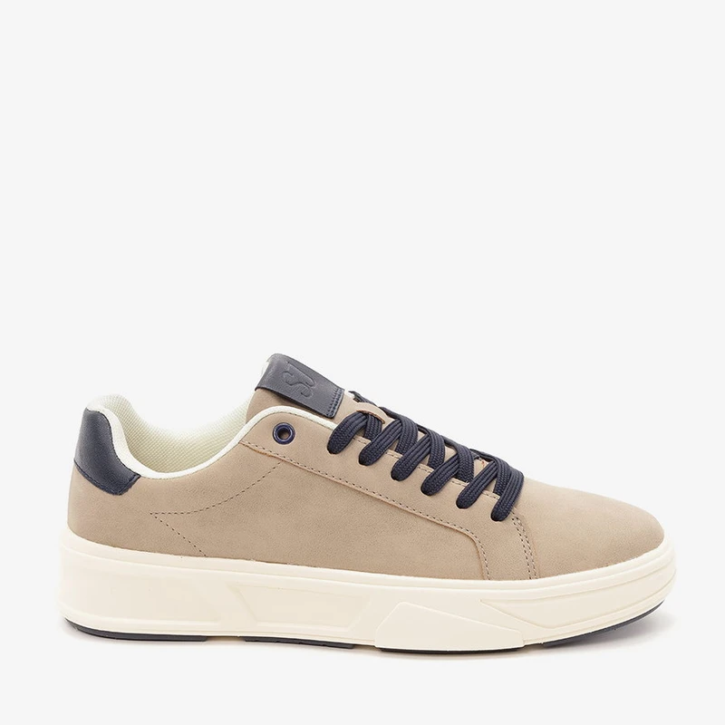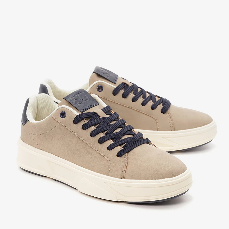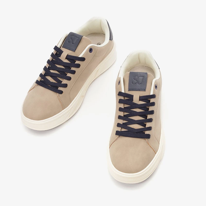 סניקרס לגברים בעיצוב חלק ונקי בגוון בז' קלאסי עם שרוכים כחולים וסוליה לבנה עבה למראה מודרני ונוכח. שילוב של אלגנטיות יומיומית עם טאץ' אורבני צעיר. סניקרס לגברים שאוהבים להיראות טוב בלי להתאמץ – לעבודה, ליציאה או ליום בעיר.
